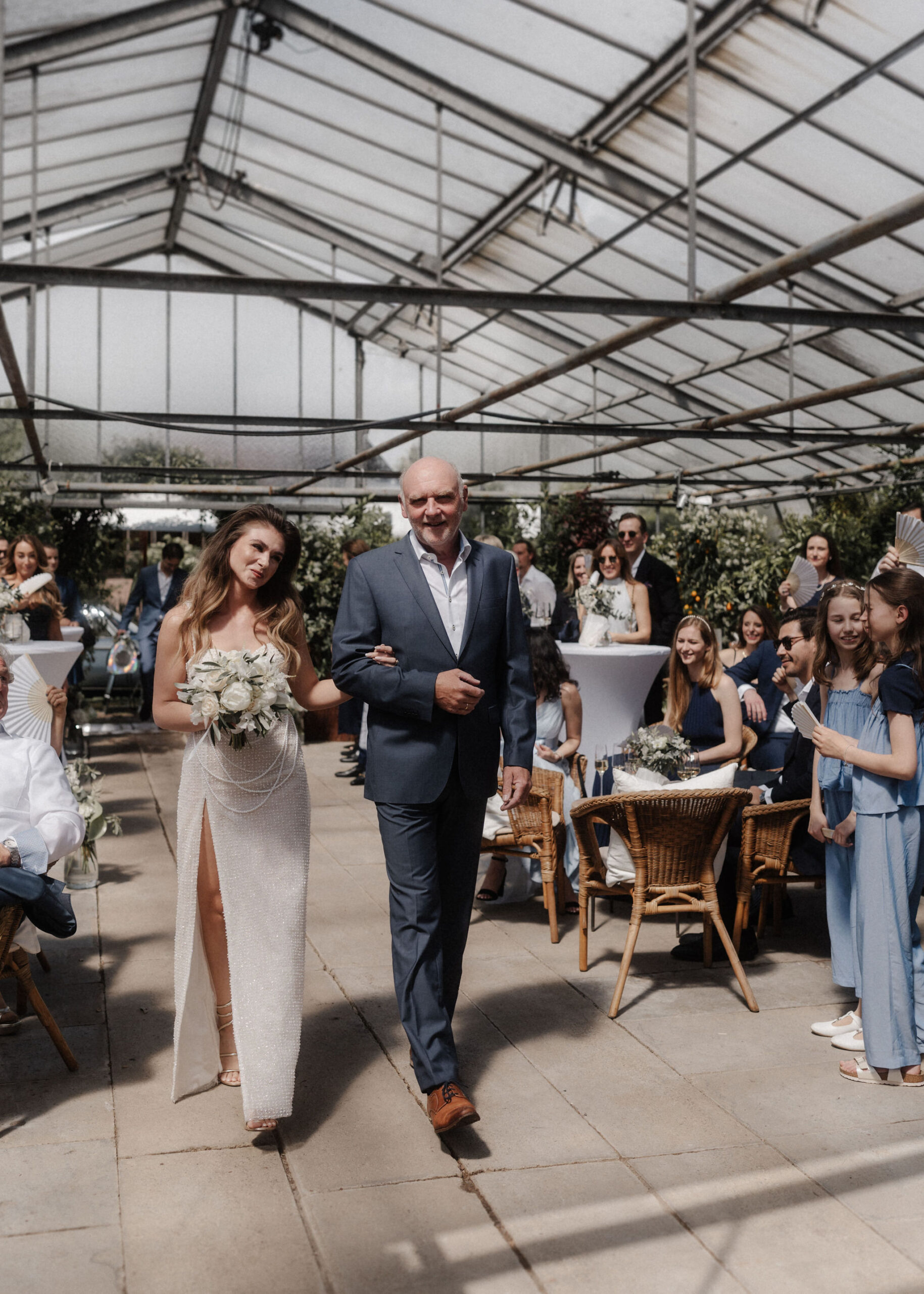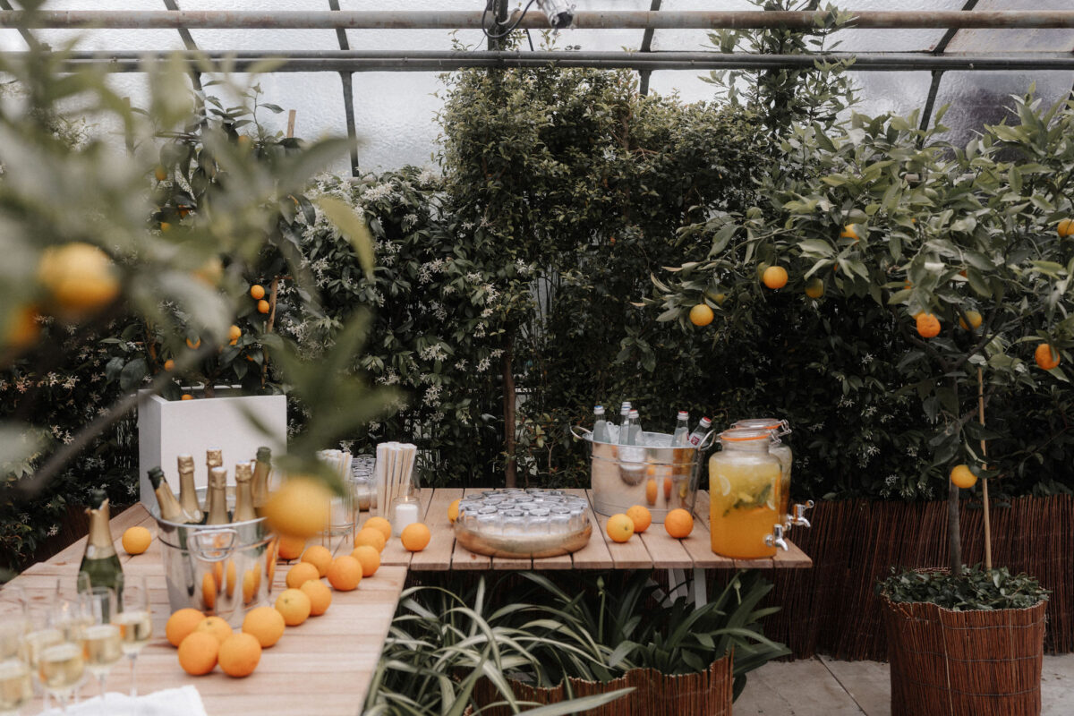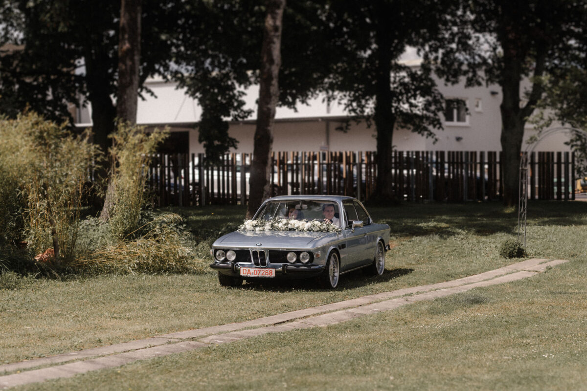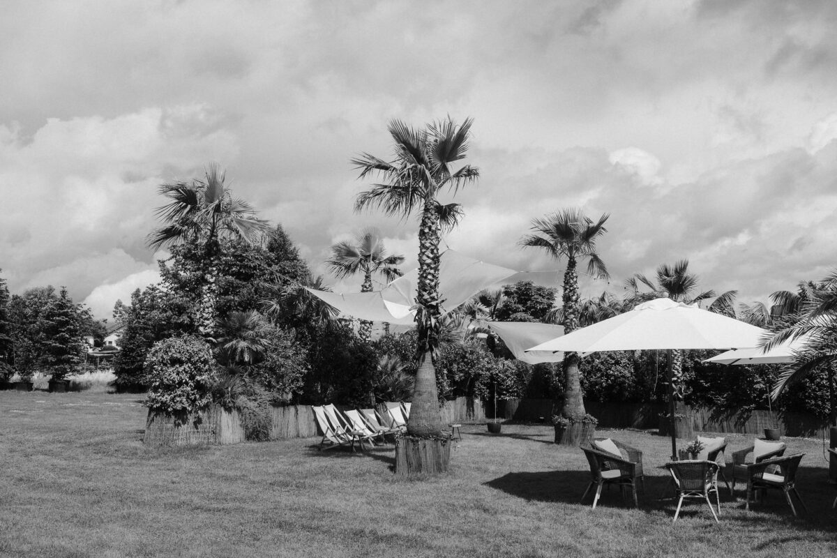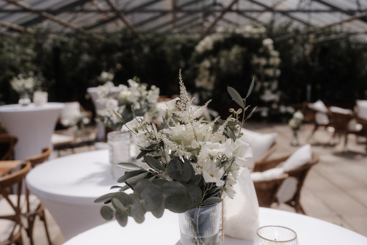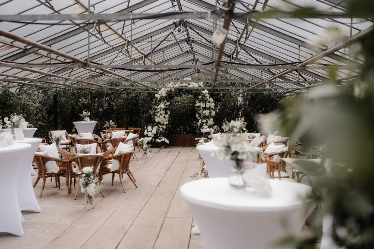 Mit einem Oldtimer fuhren sie zum Gewächshaus, wo die Gäste bereits auf eleganten Lounge-Möbeln Platz genommen hatten. Zwischen hohen Palmen, weißen Blüten und sanftem Licht gaben sich Laura und Felix unter einem üppigen Blumenbogen das Ja-Wort. Ein besonderes Highlight: Die Katze der beiden brachte – liebevoll vom Bruder der Braut getragen – die Ringe. Es war ein unvergesslicher Tag vom Start bis zur Party!