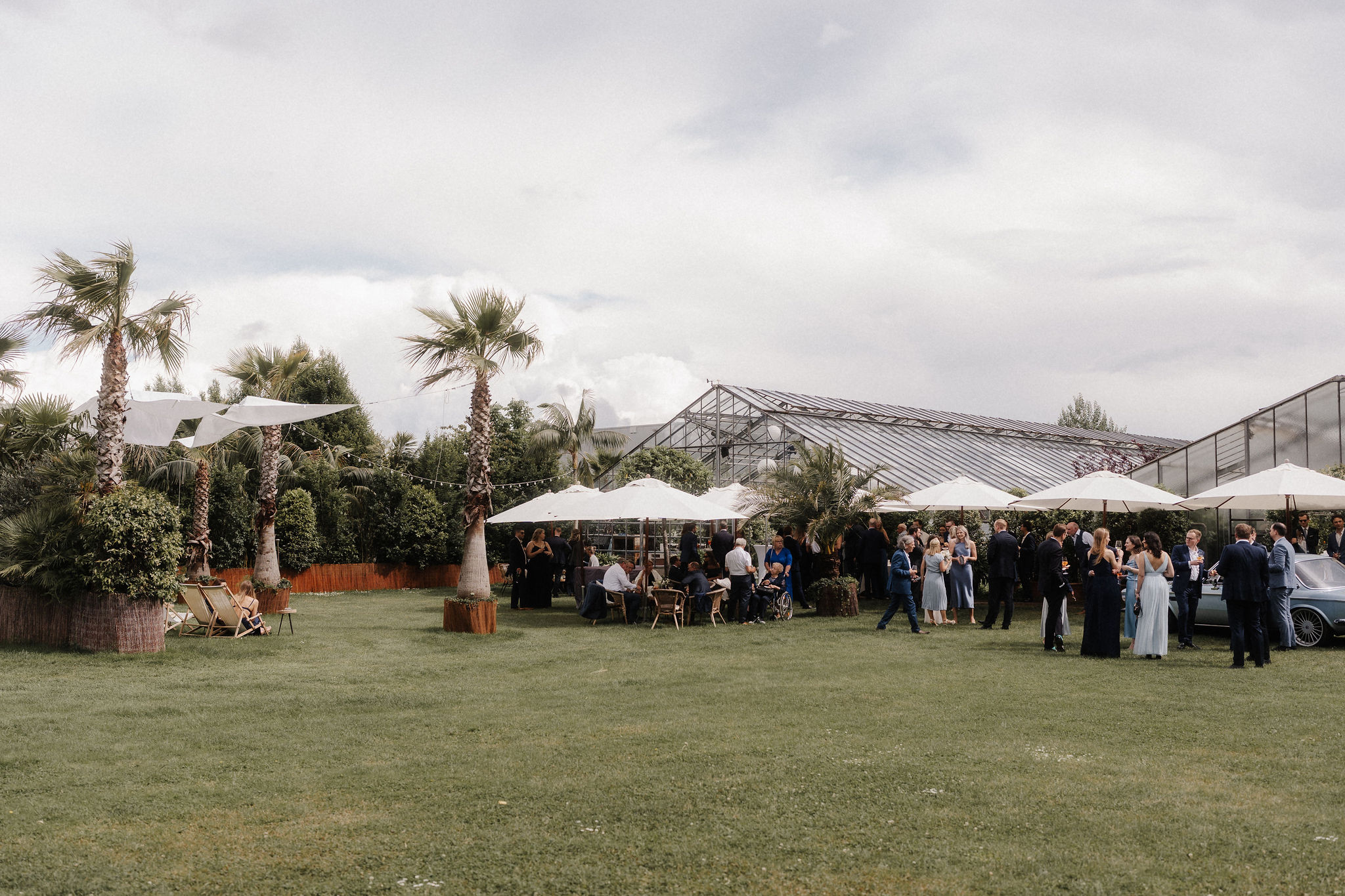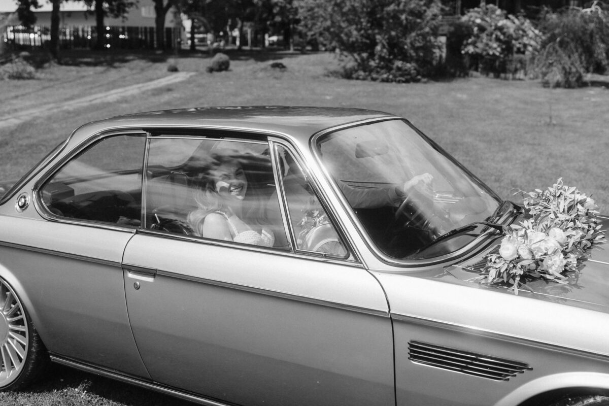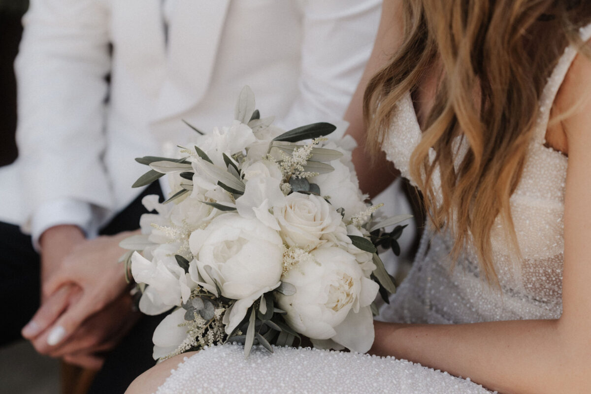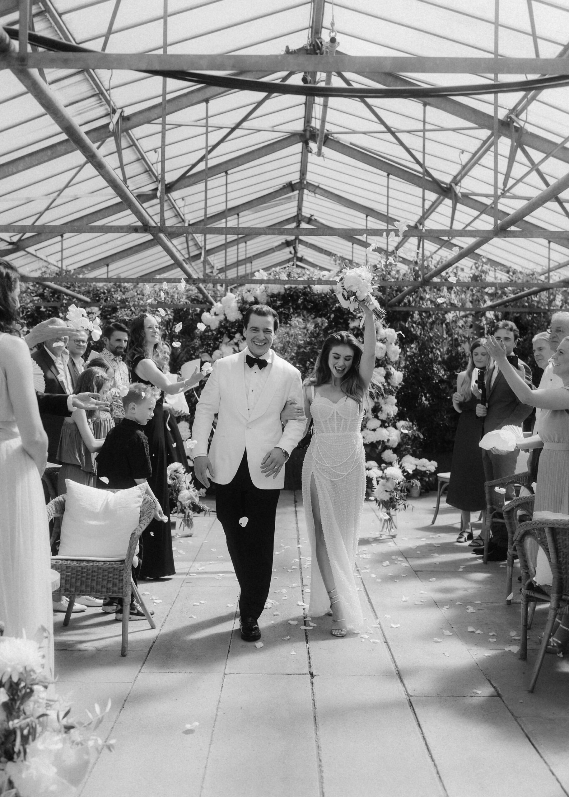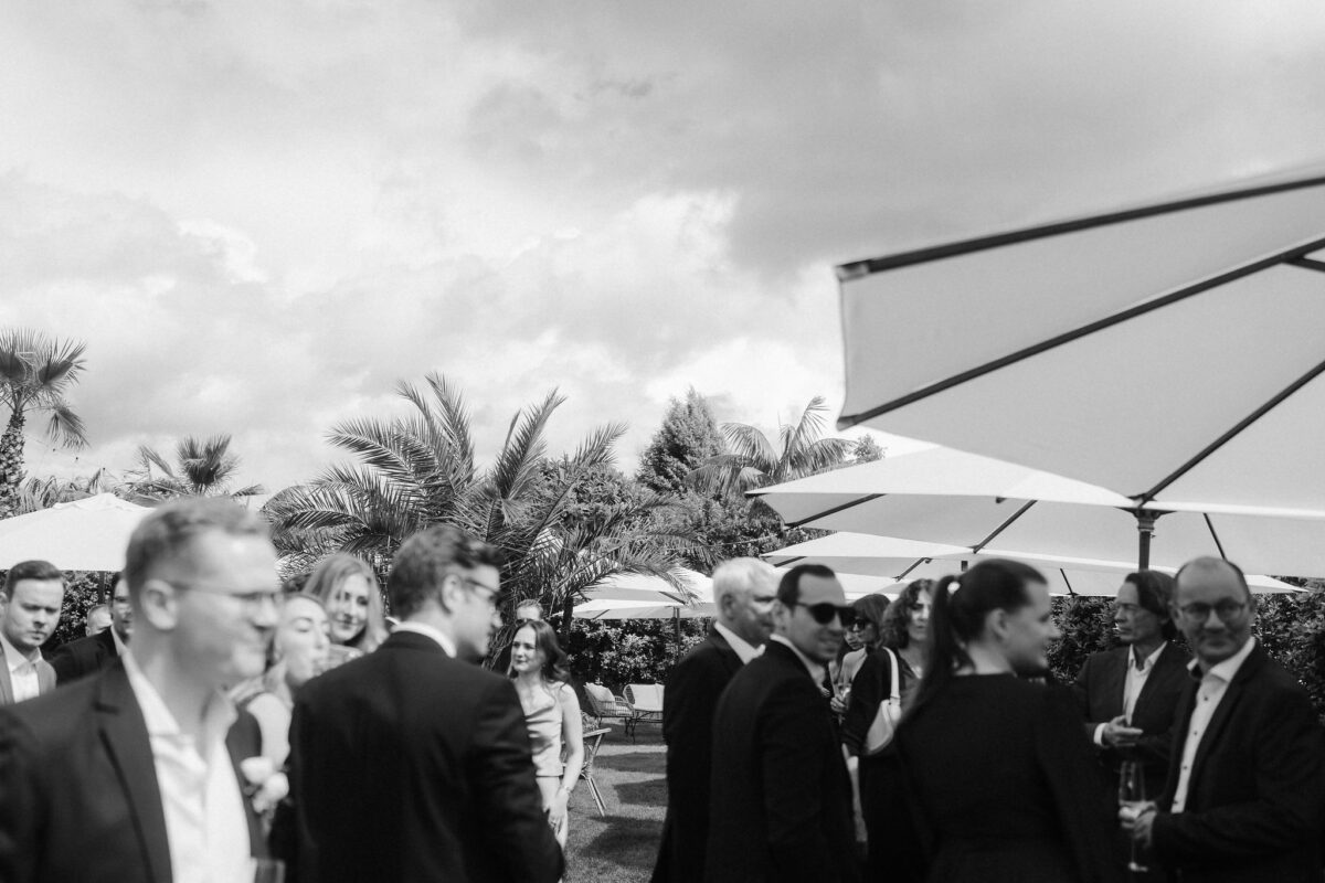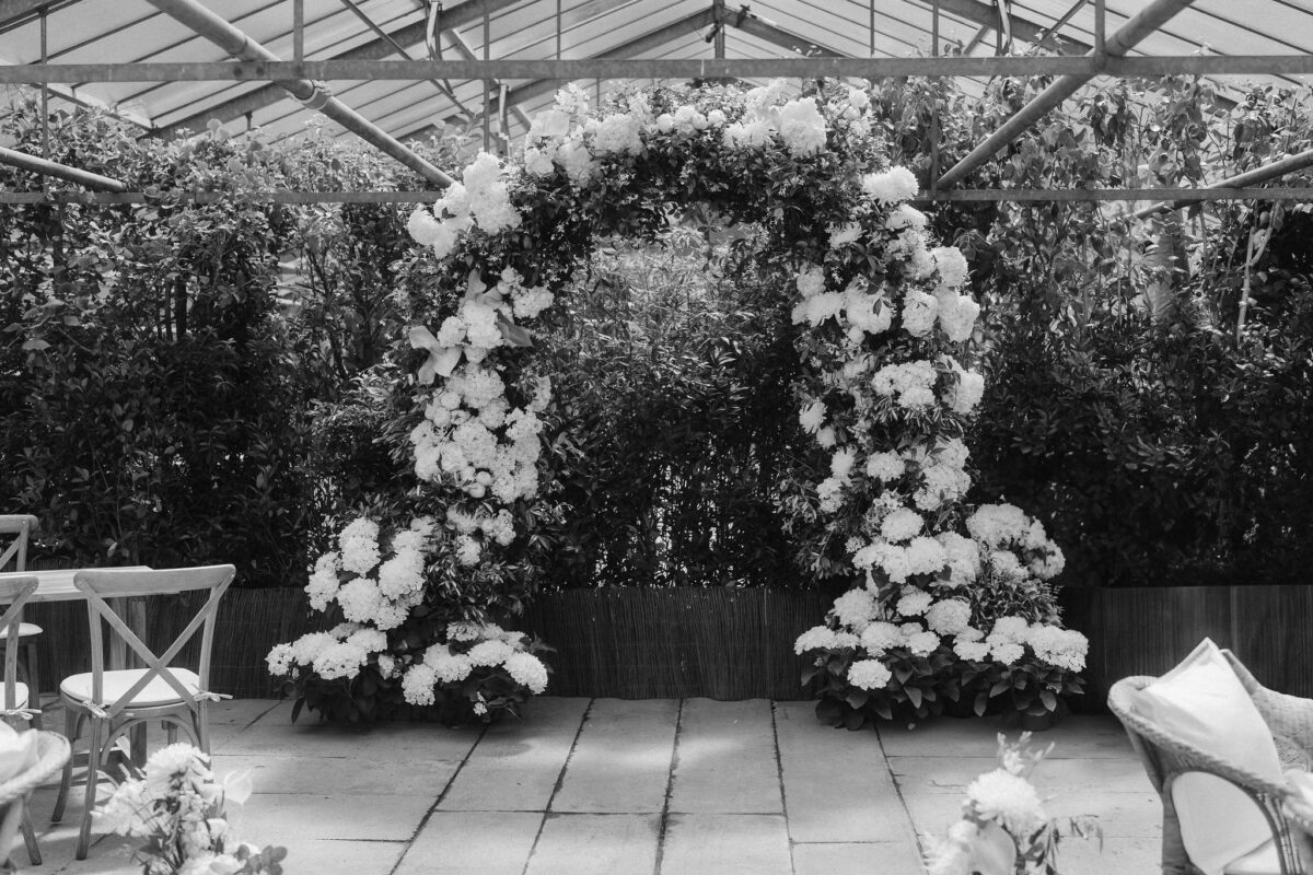 Mit einem Oldtimer fuhren sie zum Gewächshaus, wo die Gäste bereits auf eleganten Lounge-Möbeln Platz genommen hatten. Zwischen hohen Palmen, weißen Blüten und sanftem Licht gaben sich Laura und Felix unter einem üppigen Blumenbogen das Ja-Wort. Ein besonderes Highlight: Die Katze der beiden brachte – liebevoll vom Bruder der Braut getragen – die Ringe. Es war ein unvergesslicher Tag vom Start bis zur Party!