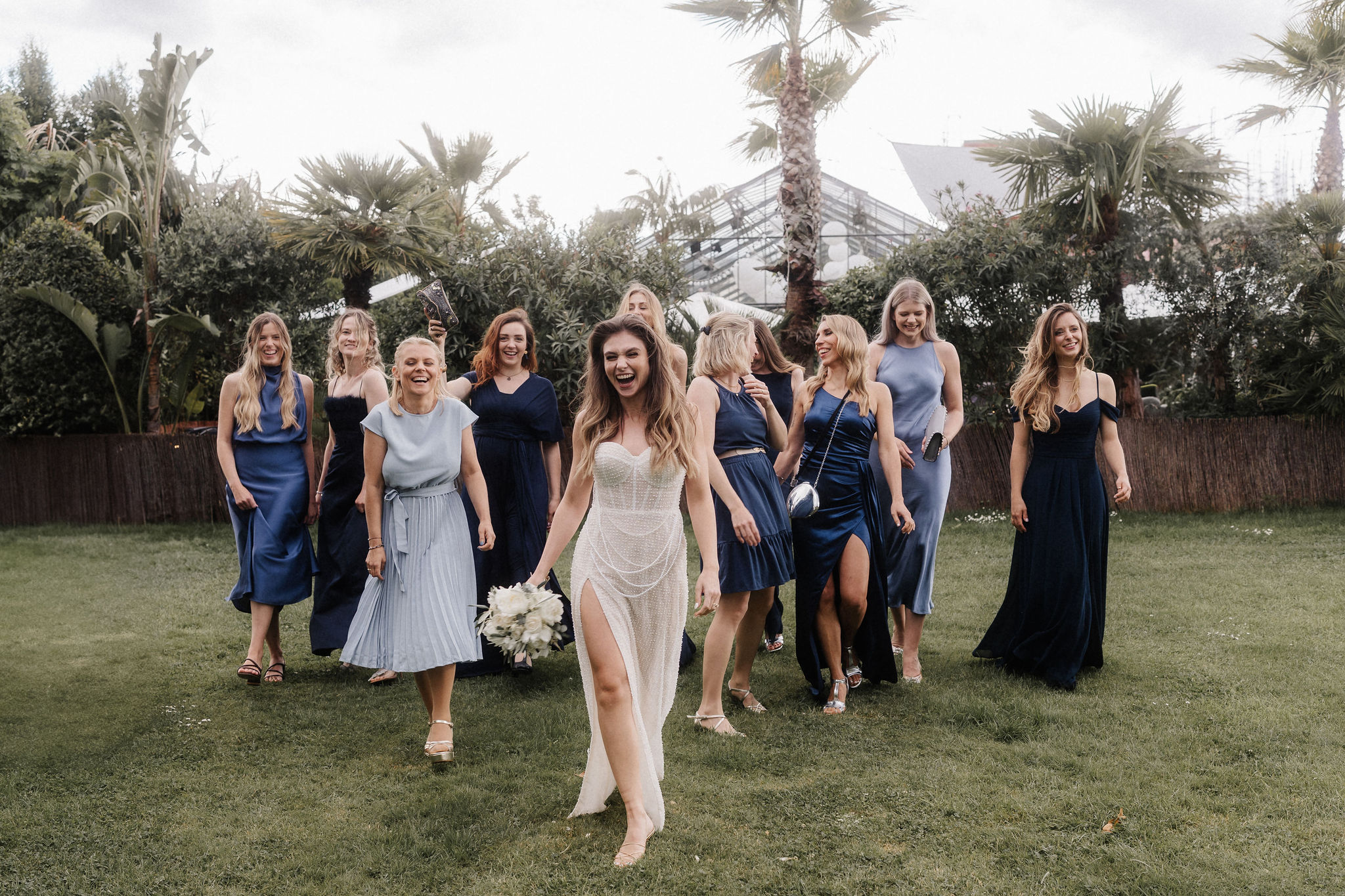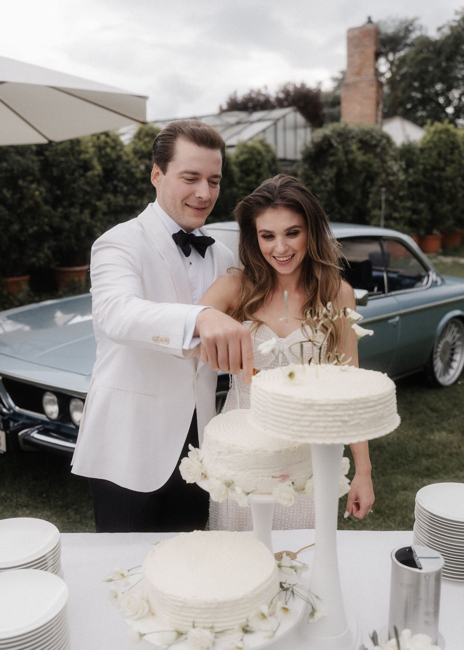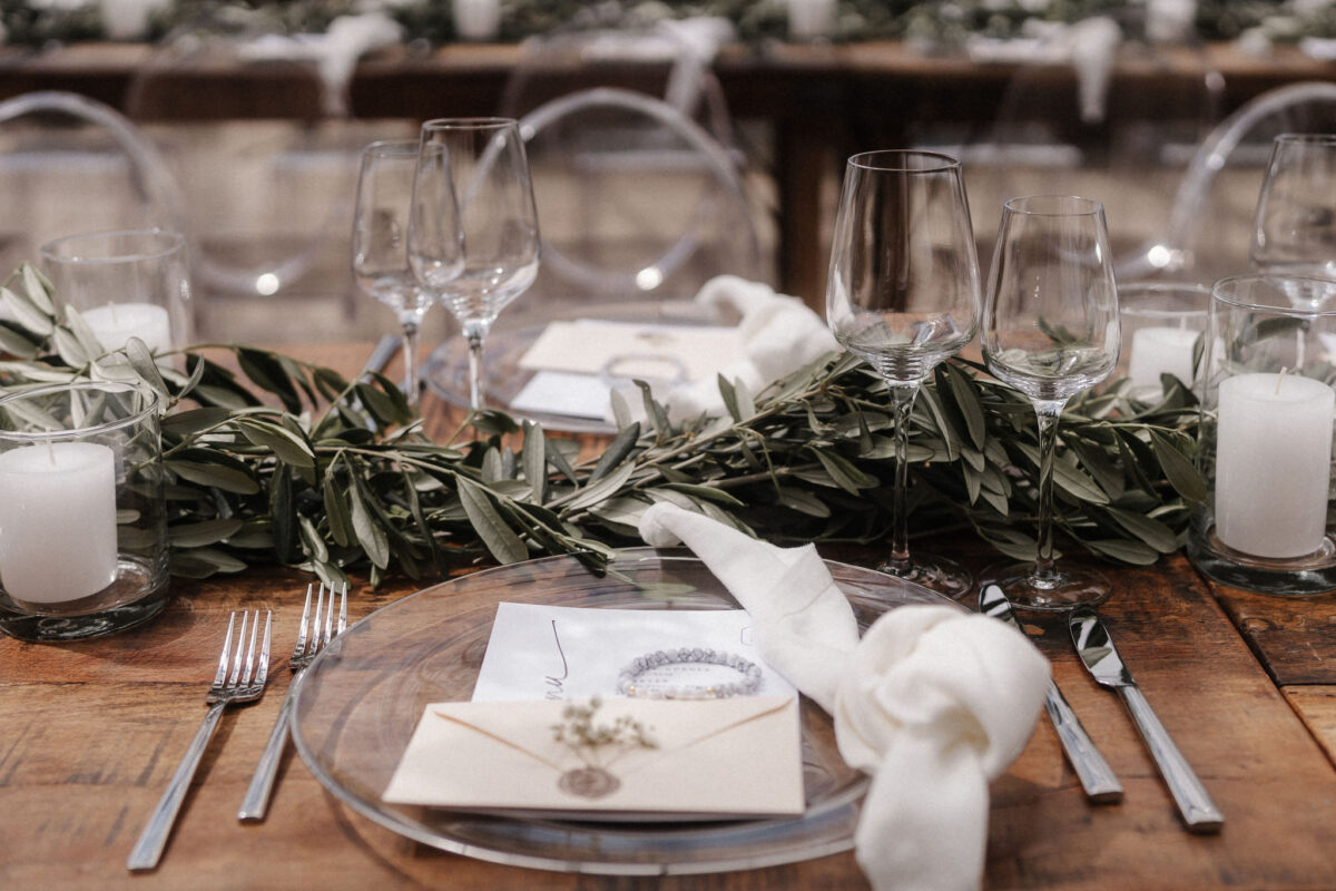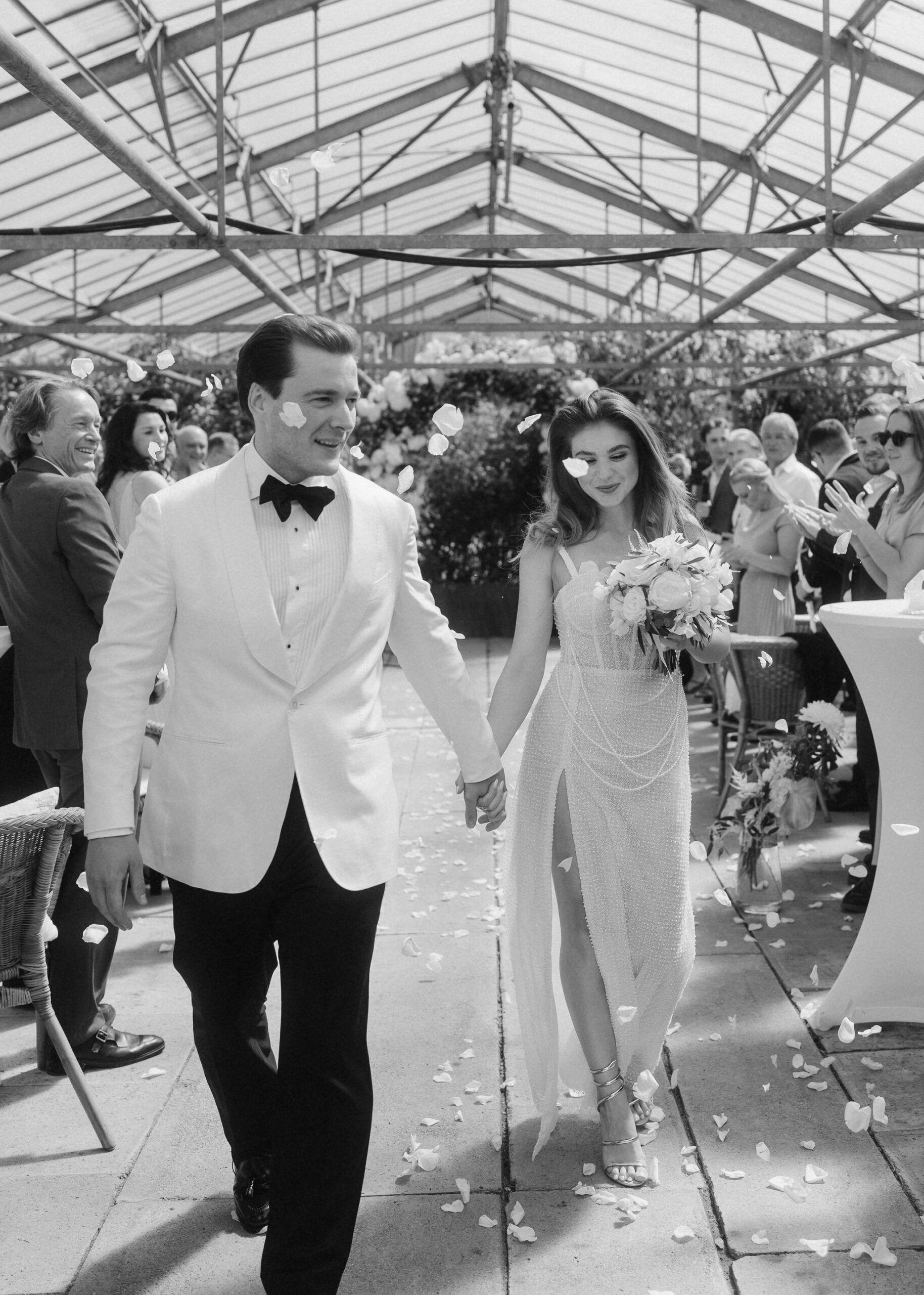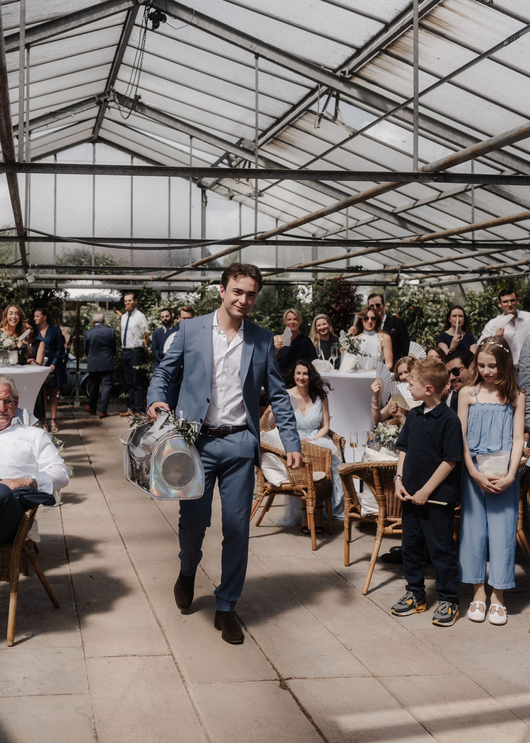 Mit einem Oldtimer fuhren sie zum Gewächshaus, wo die Gäste bereits auf eleganten Lounge-Möbeln Platz genommen hatten. Zwischen hohen Palmen, weißen Blüten und sanftem Licht gaben sich Laura und Felix unter einem üppigen Blumenbogen das Ja-Wort. Ein besonderes Highlight: Die Katze der beiden brachte – liebevoll vom Bruder der Braut getragen – die Ringe. Es war ein unvergesslicher Tag vom Start bis zur Party!