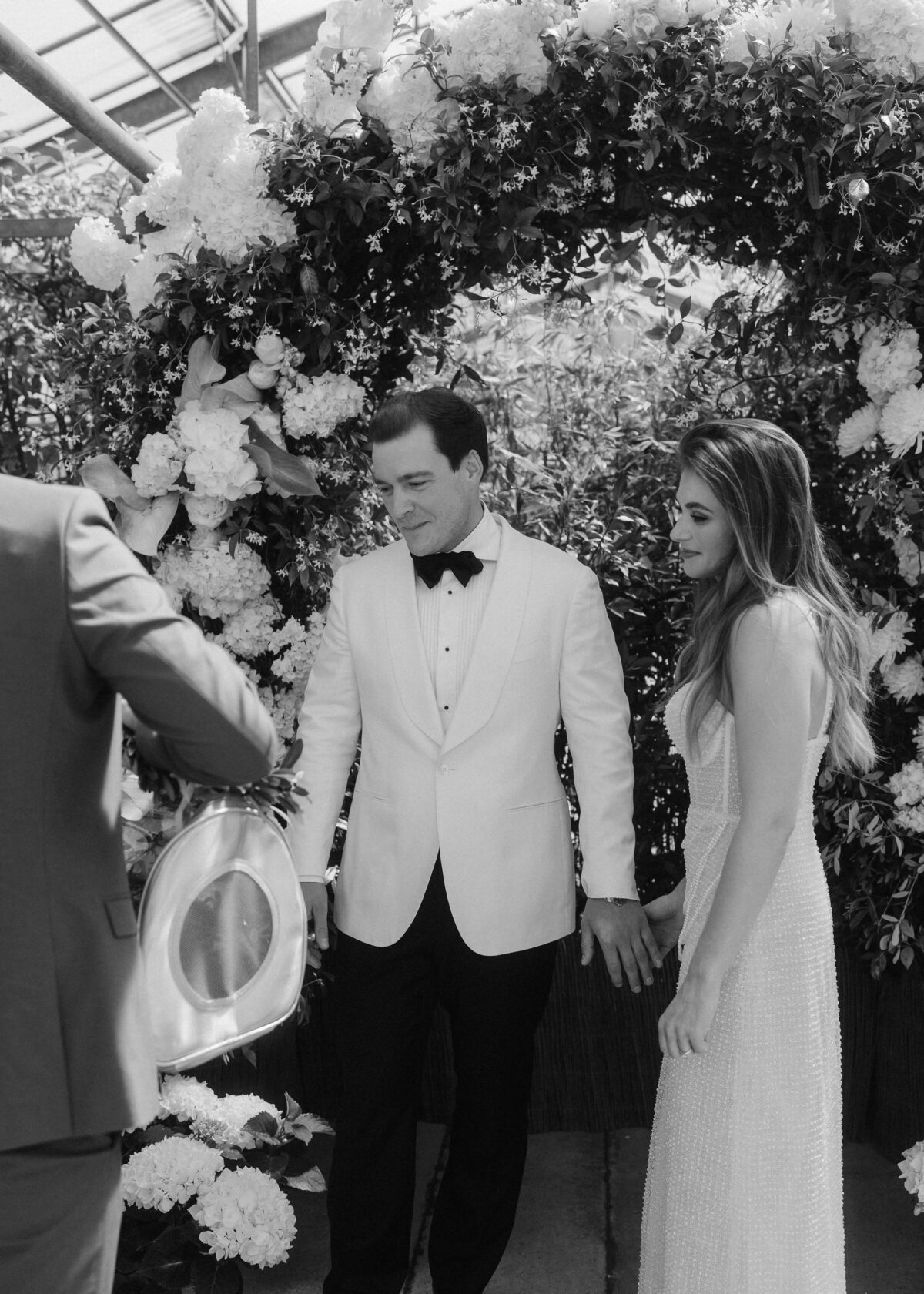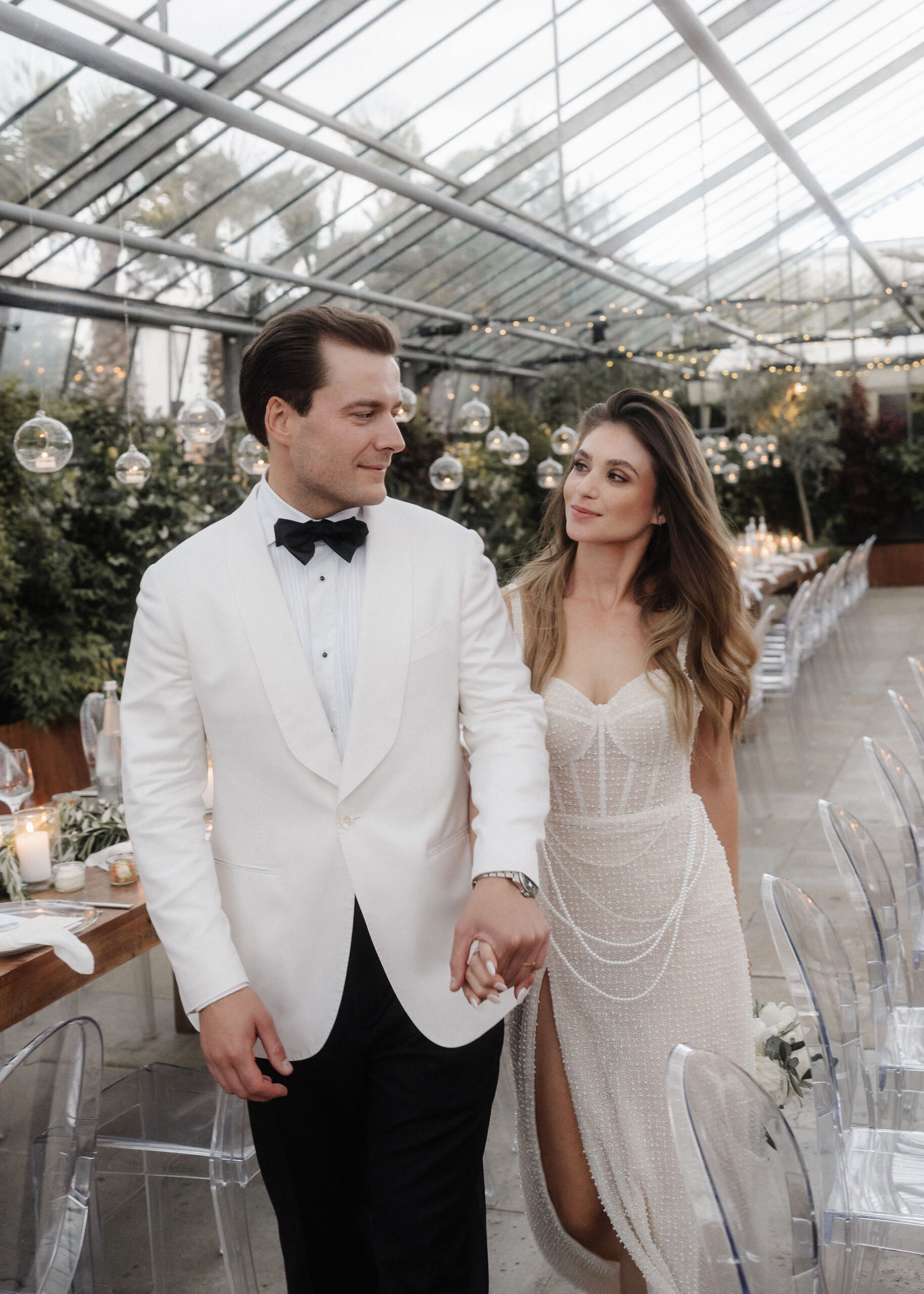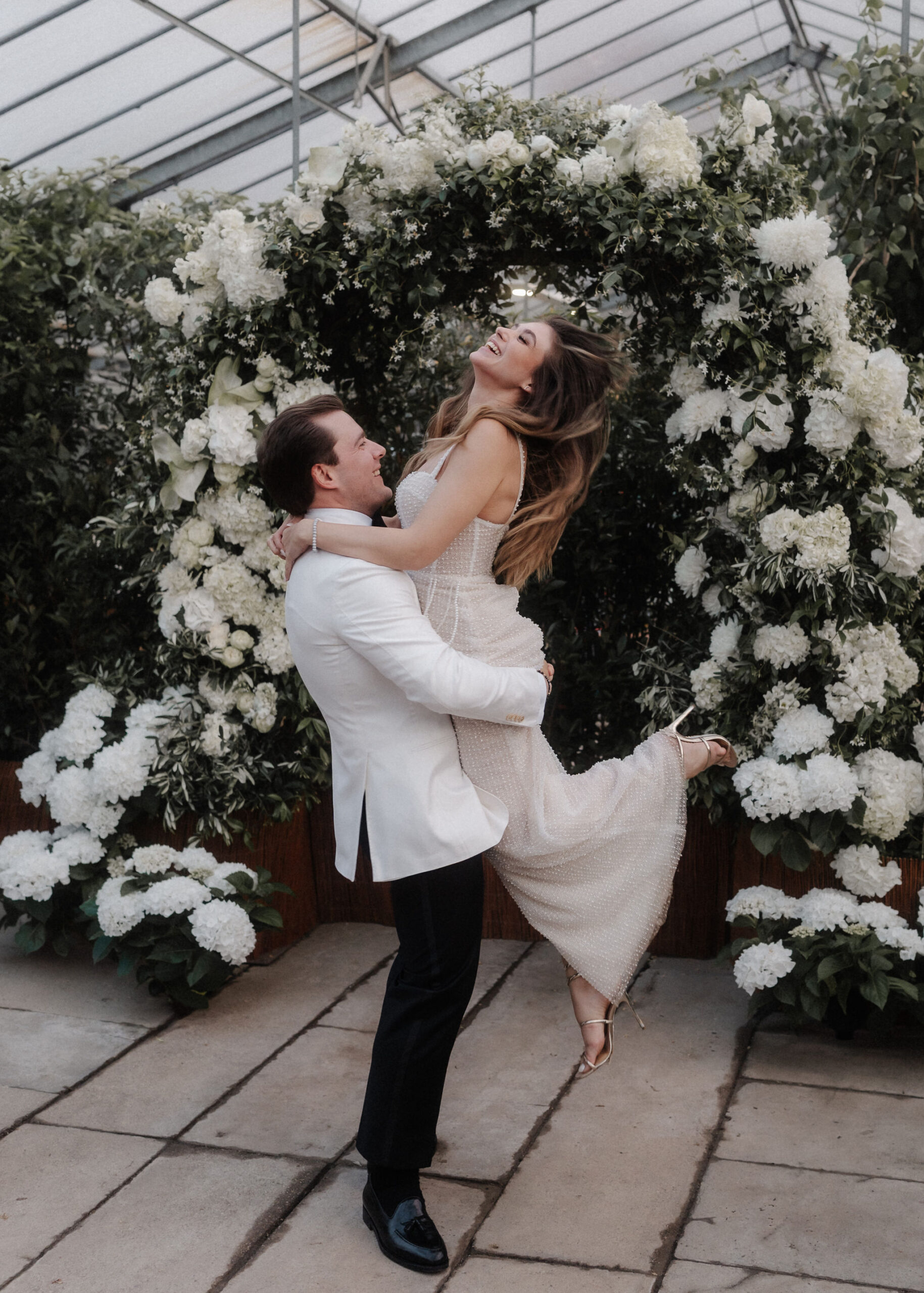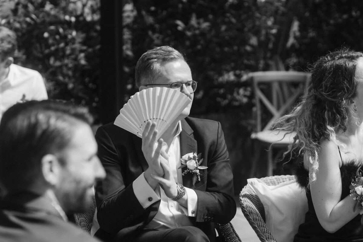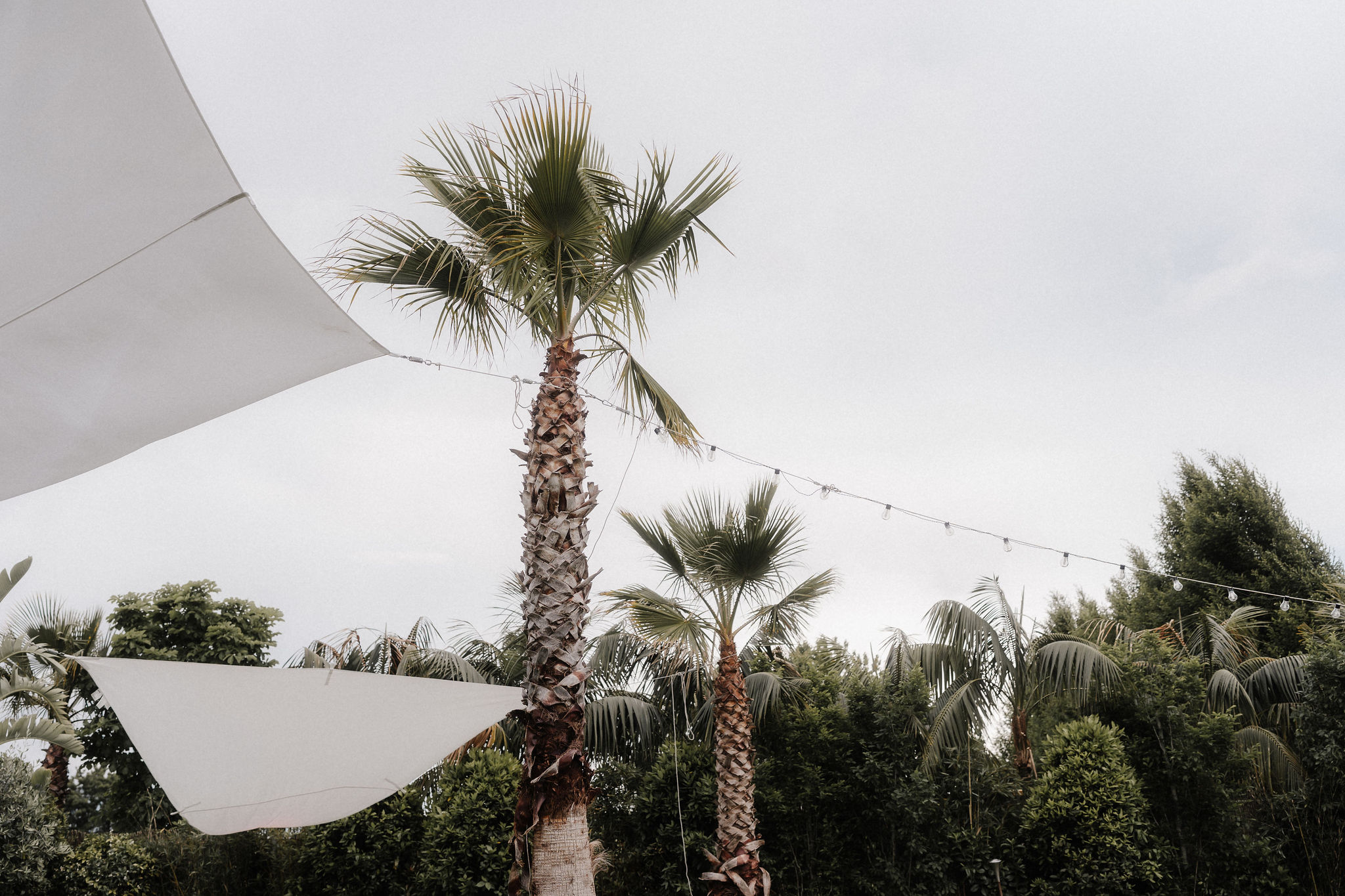 Mit einem Oldtimer fuhren sie zum Gewächshaus, wo die Gäste bereits auf eleganten Lounge-Möbeln Platz genommen hatten. Zwischen hohen Palmen, weißen Blüten und sanftem Licht gaben sich Laura und Felix unter einem üppigen Blumenbogen das Ja-Wort. Ein besonderes Highlight: Die Katze der beiden brachte – liebevoll vom Bruder der Braut getragen – die Ringe. Es war ein unvergesslicher Tag vom Start bis zur Party!