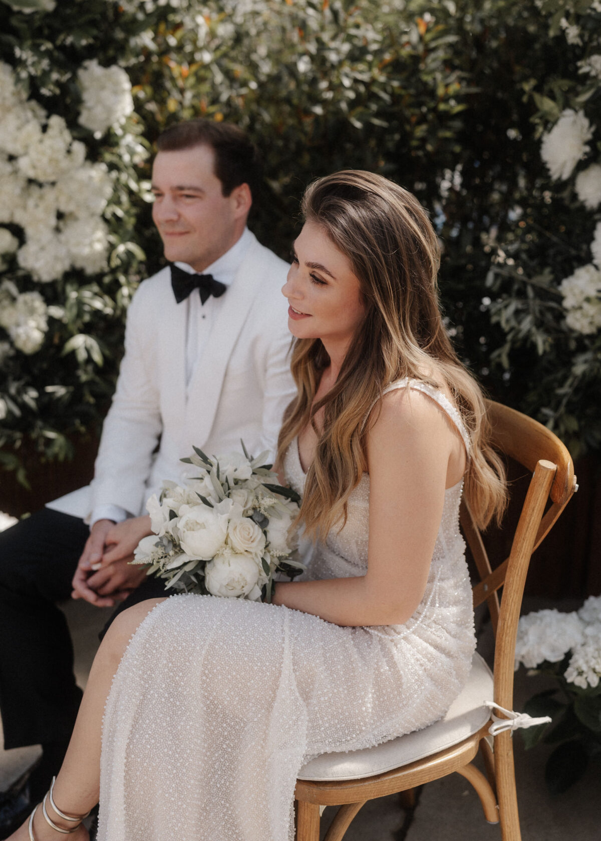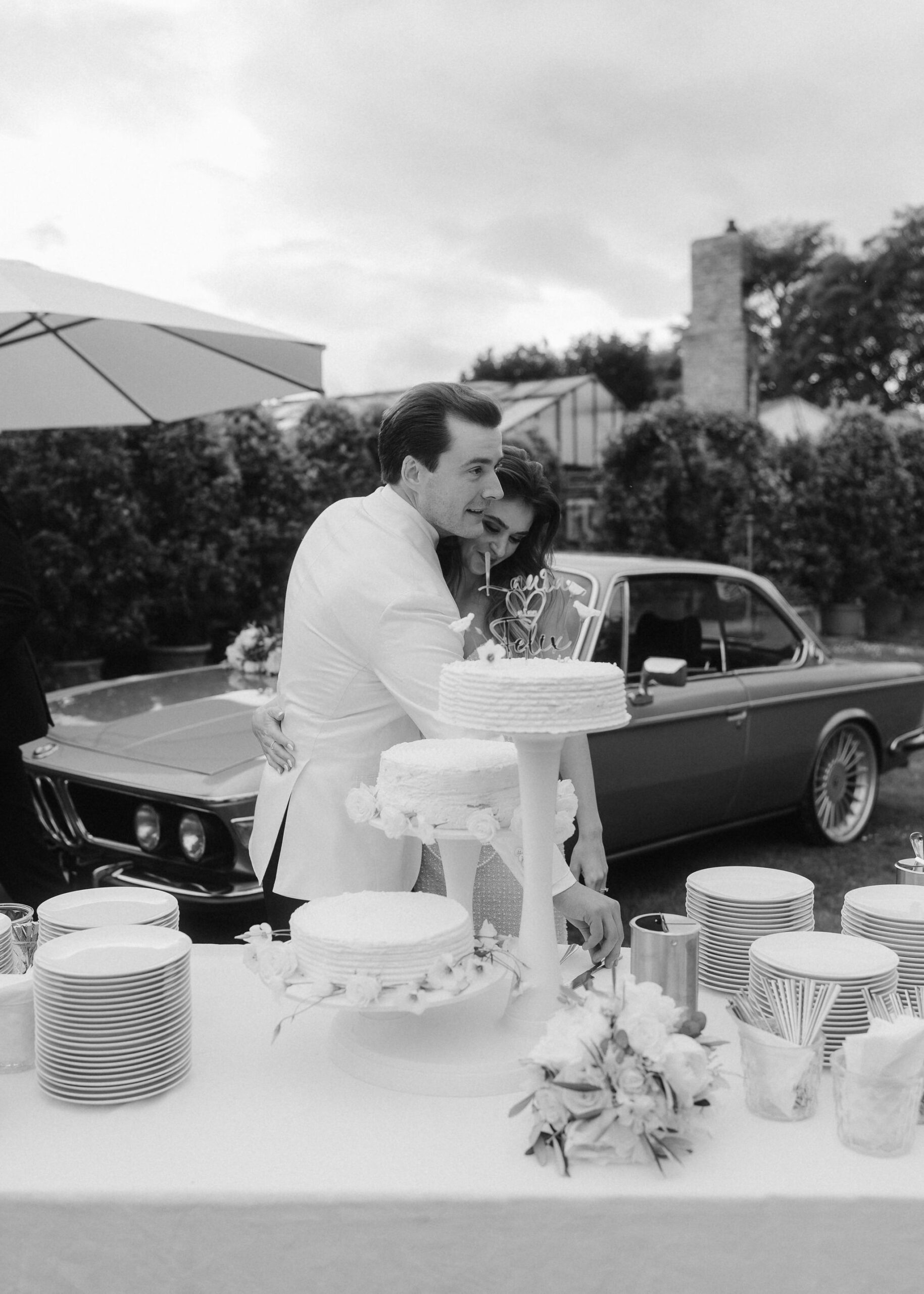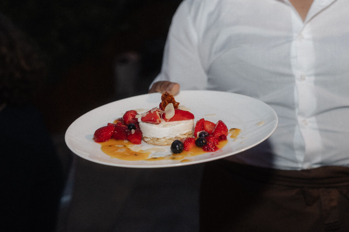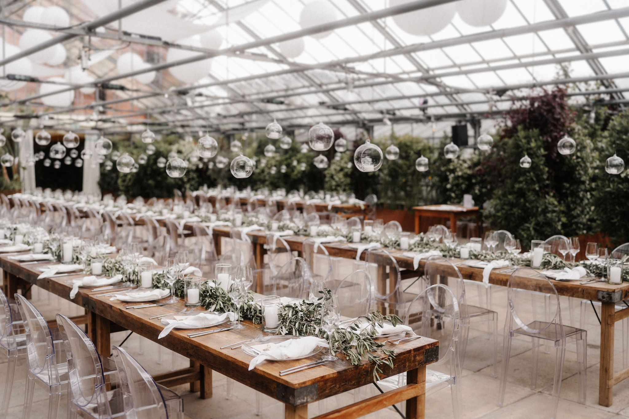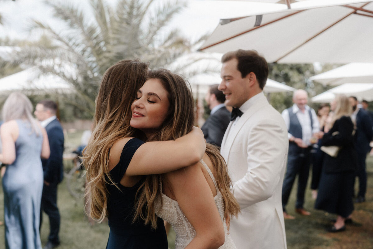 Mit einem Oldtimer fuhren sie zum Gewächshaus, wo die Gäste bereits auf eleganten Lounge-Möbeln Platz genommen hatten. Zwischen hohen Palmen, weißen Blüten und sanftem Licht gaben sich Laura und Felix unter einem üppigen Blumenbogen das Ja-Wort. Ein besonderes Highlight: Die Katze der beiden brachte – liebevoll vom Bruder der Braut getragen – die Ringe. Es war ein unvergesslicher Tag vom Start bis zur Party!