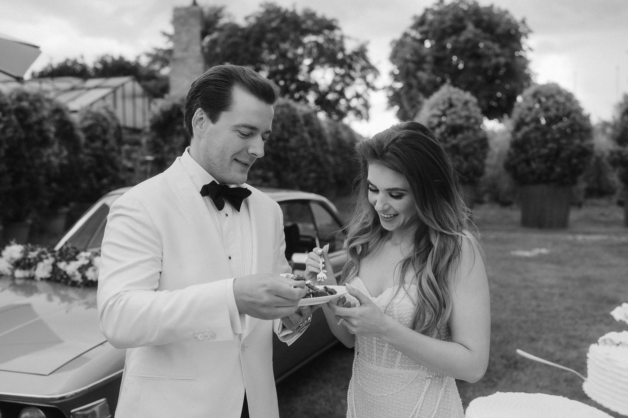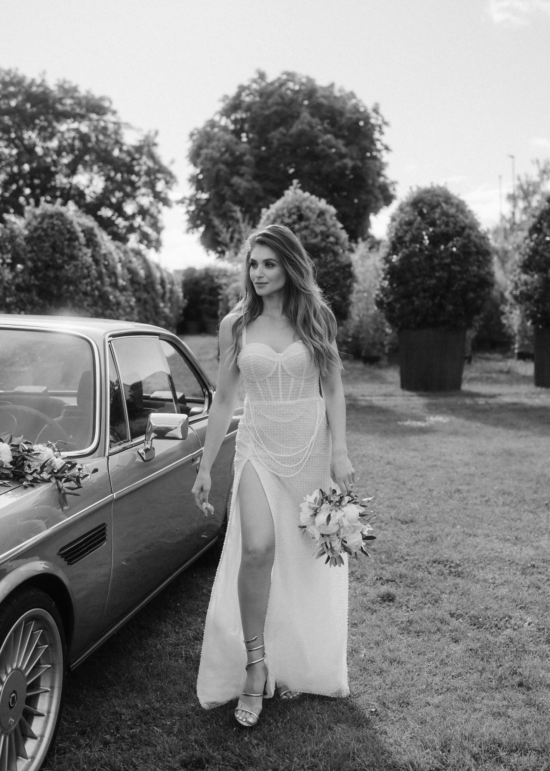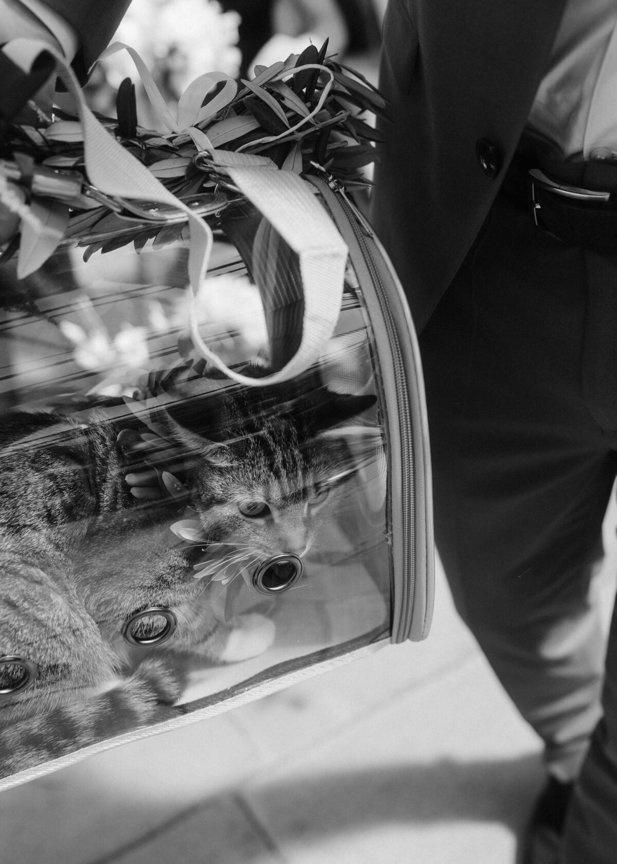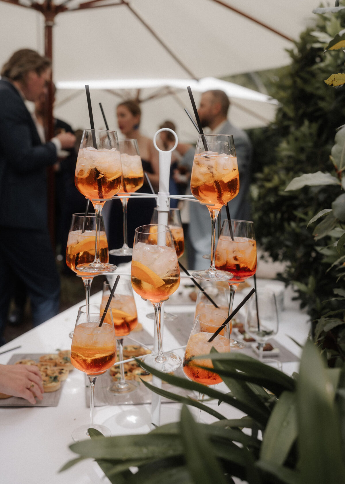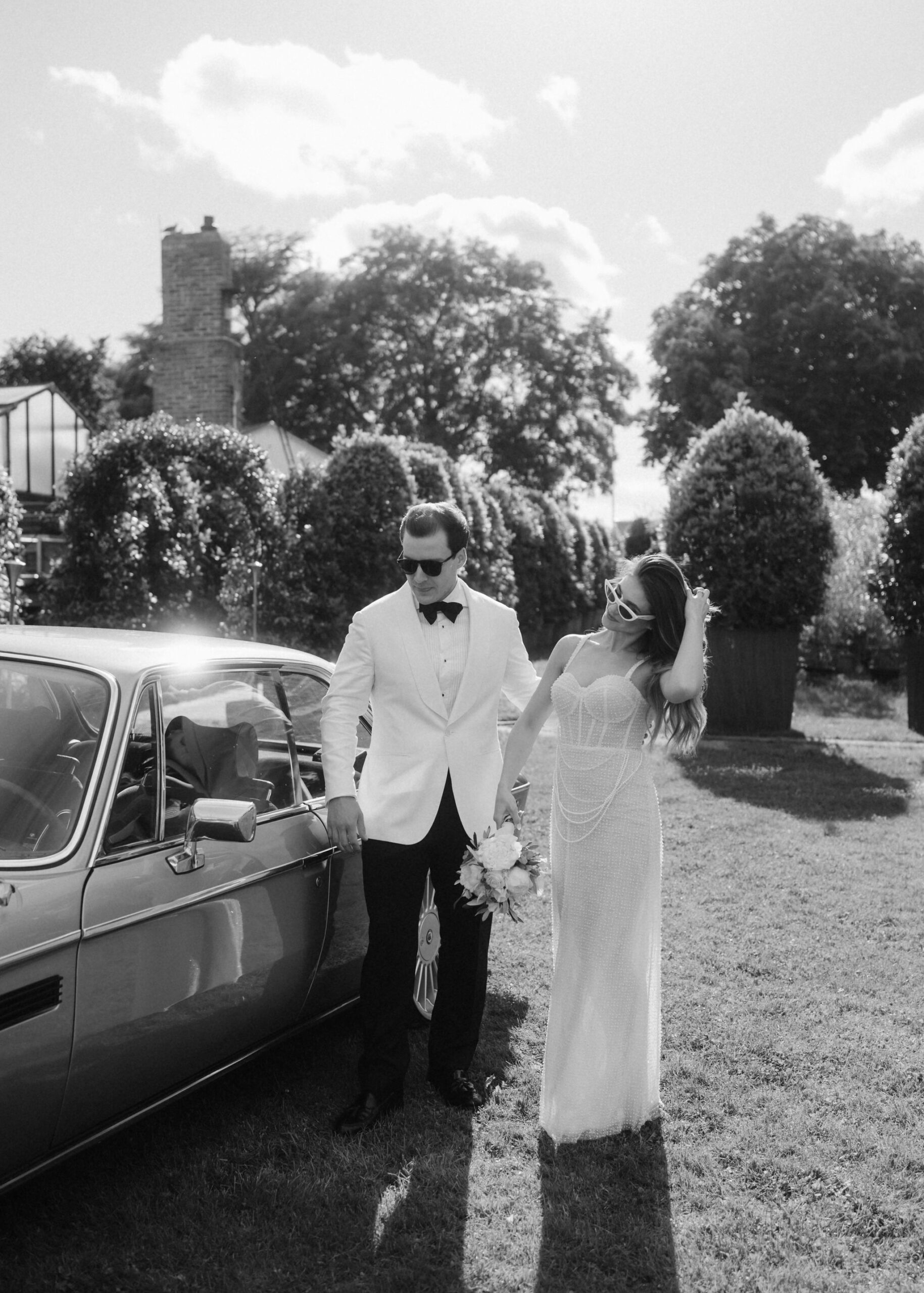 Mit einem Oldtimer fuhren sie zum Gewächshaus, wo die Gäste bereits auf eleganten Lounge-Möbeln Platz genommen hatten. Zwischen hohen Palmen, weißen Blüten und sanftem Licht gaben sich Laura und Felix unter einem üppigen Blumenbogen das Ja-Wort. Ein besonderes Highlight: Die Katze der beiden brachte – liebevoll vom Bruder der Braut getragen – die Ringe. Es war ein unvergesslicher Tag vom Start bis zur Party!