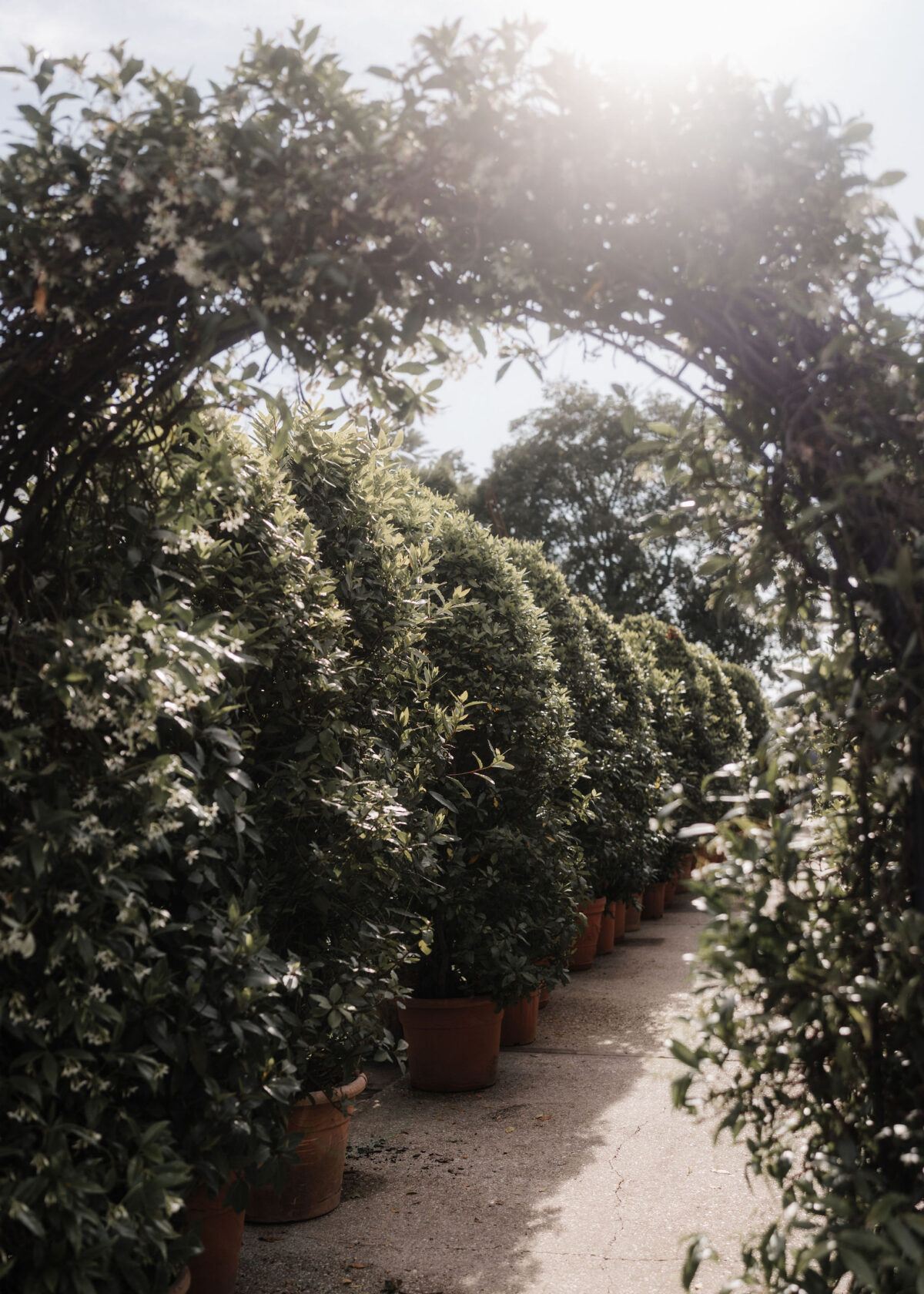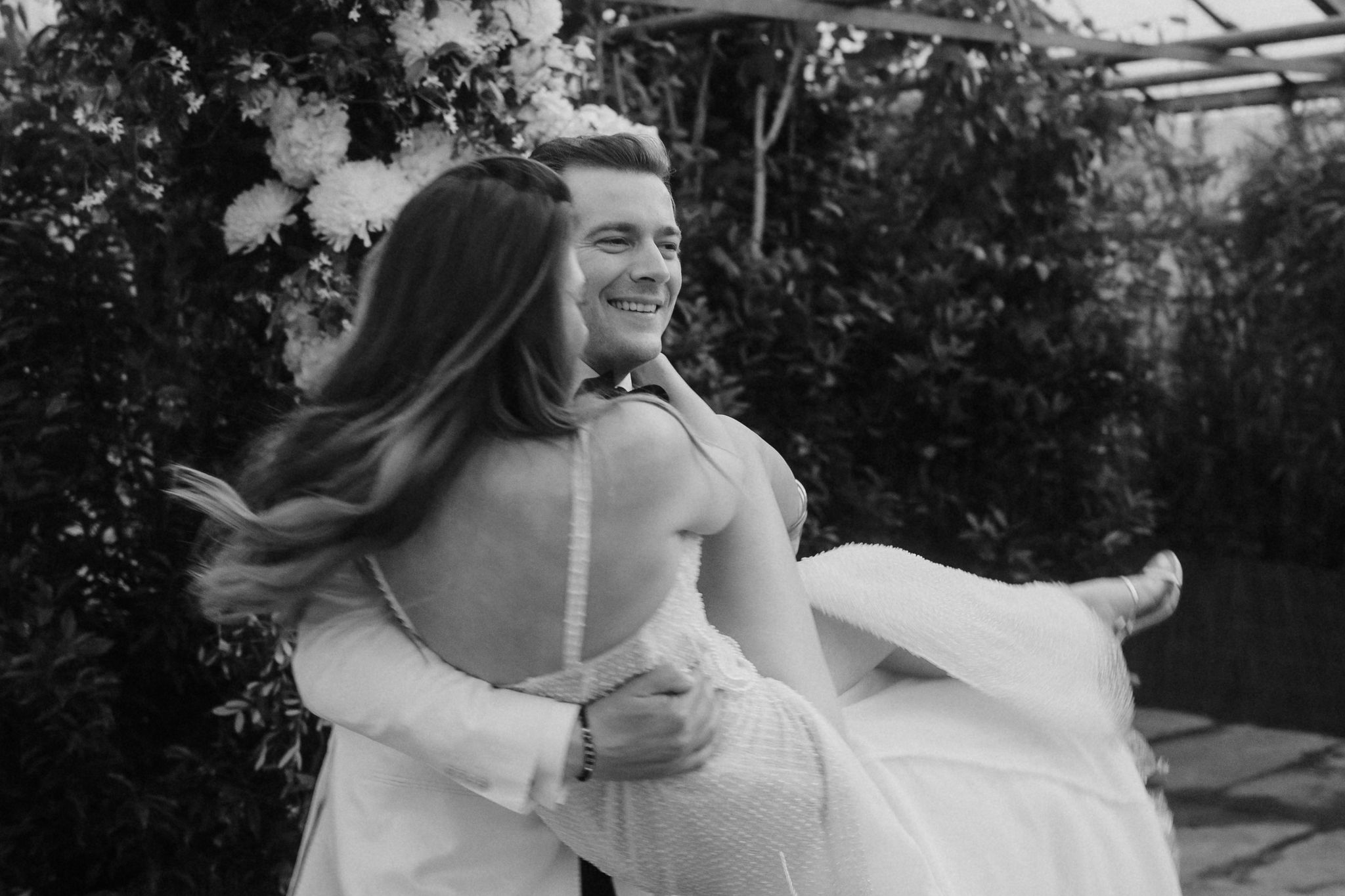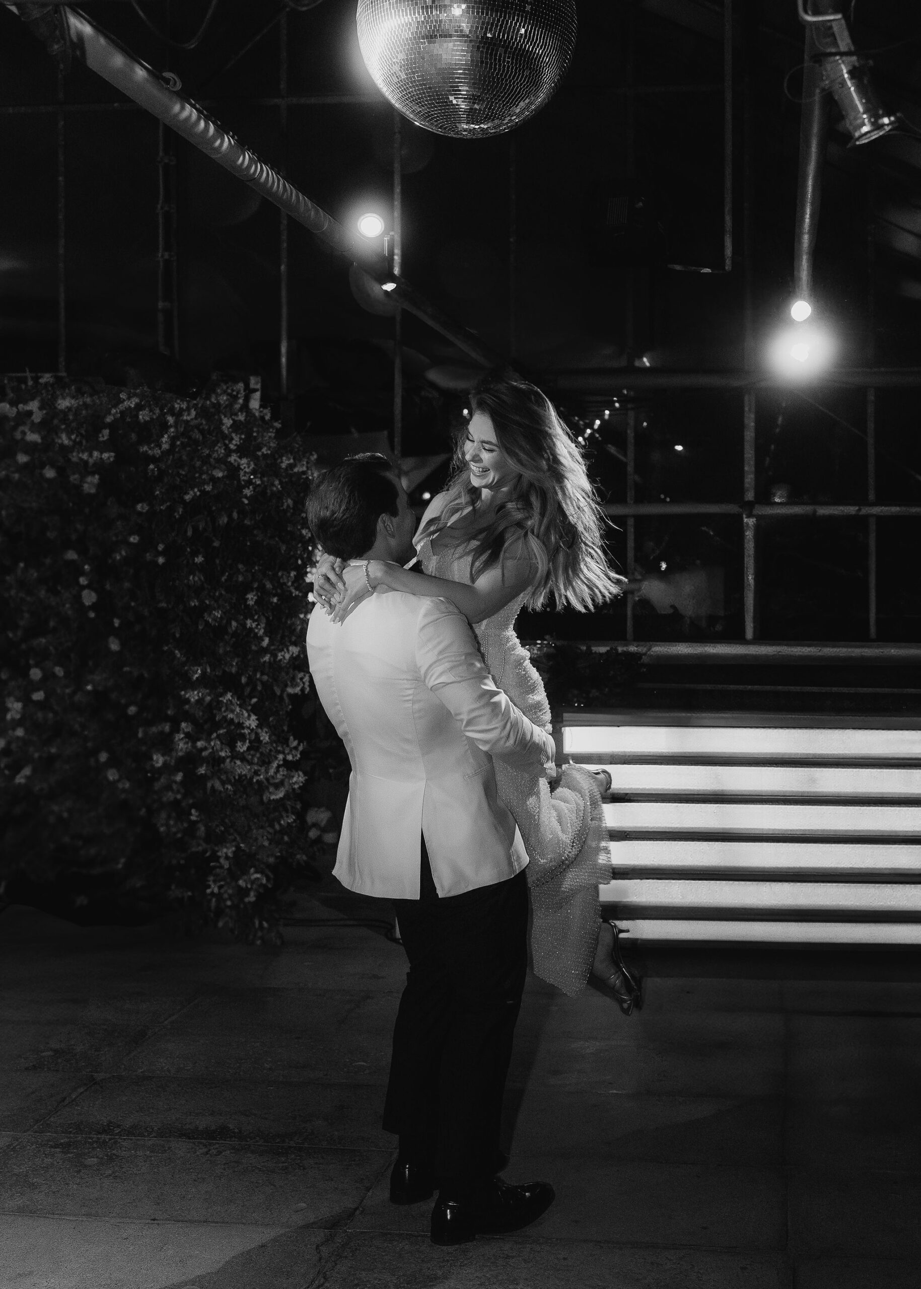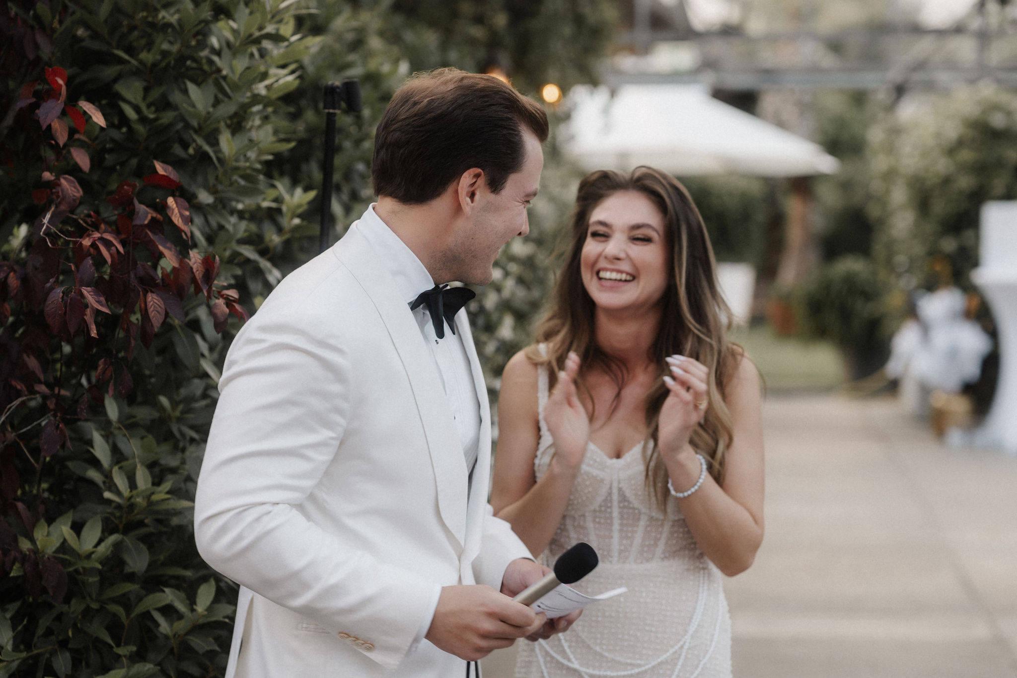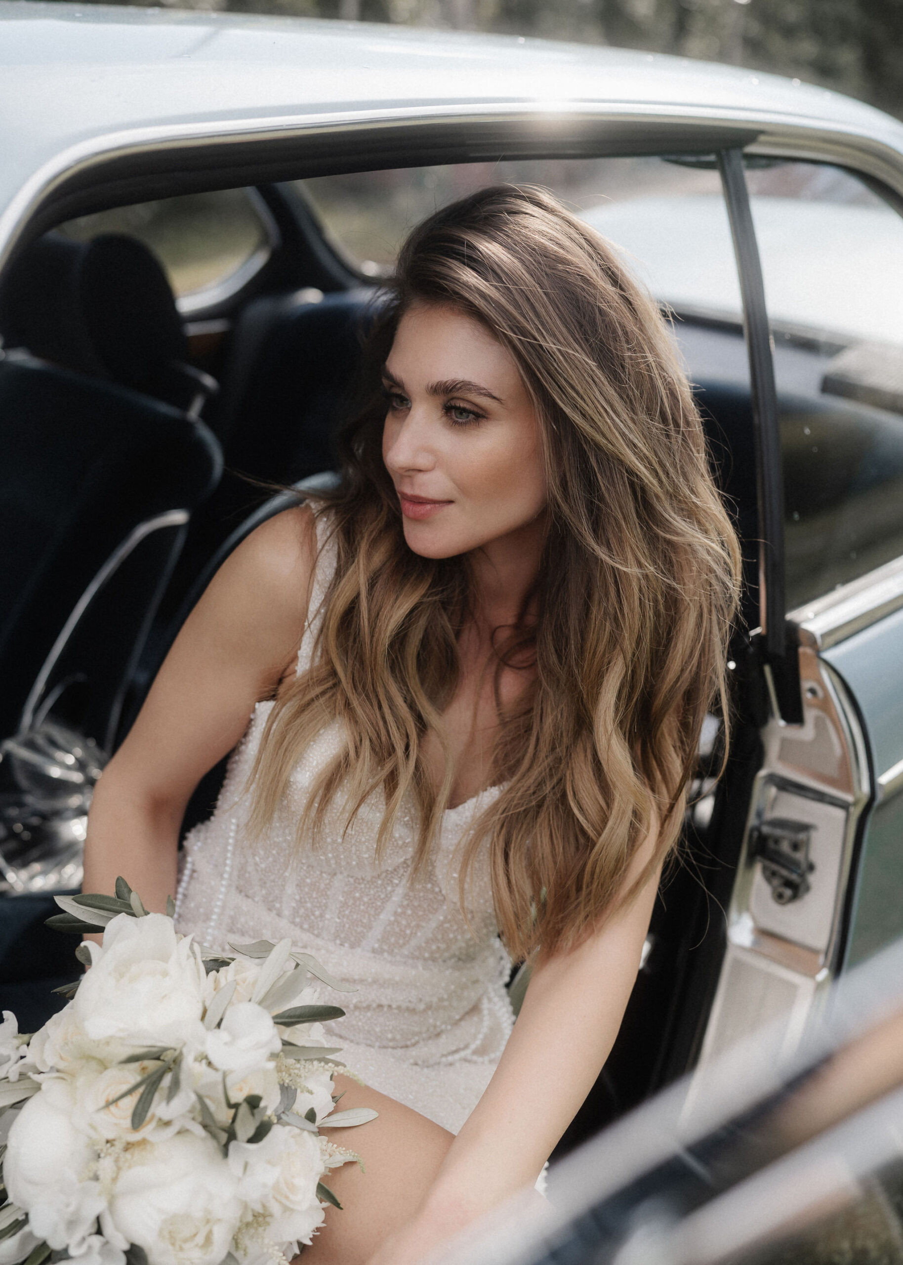 Mit einem Oldtimer fuhren sie zum Gewächshaus, wo die Gäste bereits auf eleganten Lounge-Möbeln Platz genommen hatten. Zwischen hohen Palmen, weißen Blüten und sanftem Licht gaben sich Laura und Felix unter einem üppigen Blumenbogen das Ja-Wort. Ein besonderes Highlight: Die Katze der beiden brachte – liebevoll vom Bruder der Braut getragen – die Ringe. Es war ein unvergesslicher Tag vom Start bis zur Party!
